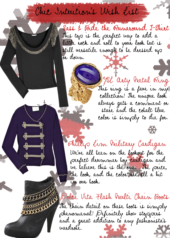 Do I ever have a treat for my HighEnders in these final frenetic days leading up to Christmas! I’m sure y’all are ALLLLLL shopped out, grabbing gifts for everyone from Dear Ol’ Dad to Annoying Aunt Alice. Well, there is nothin’ wrong with getting a lil’ sumthin’ sumthin’ for numero uno. That would be you, yourself and…tu! Thankfully for you, the ToDieFor duo from my latest blog oBSeSsIOn (cue the Mariah!), Chic Intuition, is sharing their holiday wishlist. Get ready for some major whOa eeM Gee! And if you’re feeling more selfless than selfish, gift one of these glorious numbers for your fave sis or best gal pal. Just have your sticky fingers shimmy ready ;)