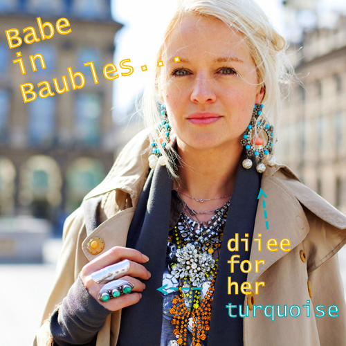 Well, chicsters, I think Mimi’s found her match in Betty Baubles above. This lovely lady via The Sartorialist is rockin’ her chandelier earrings, double-finger ring and nest of necklaces with the air of nonchalance that is so crucial to making this habit HighEnd and not crazy bag lady.