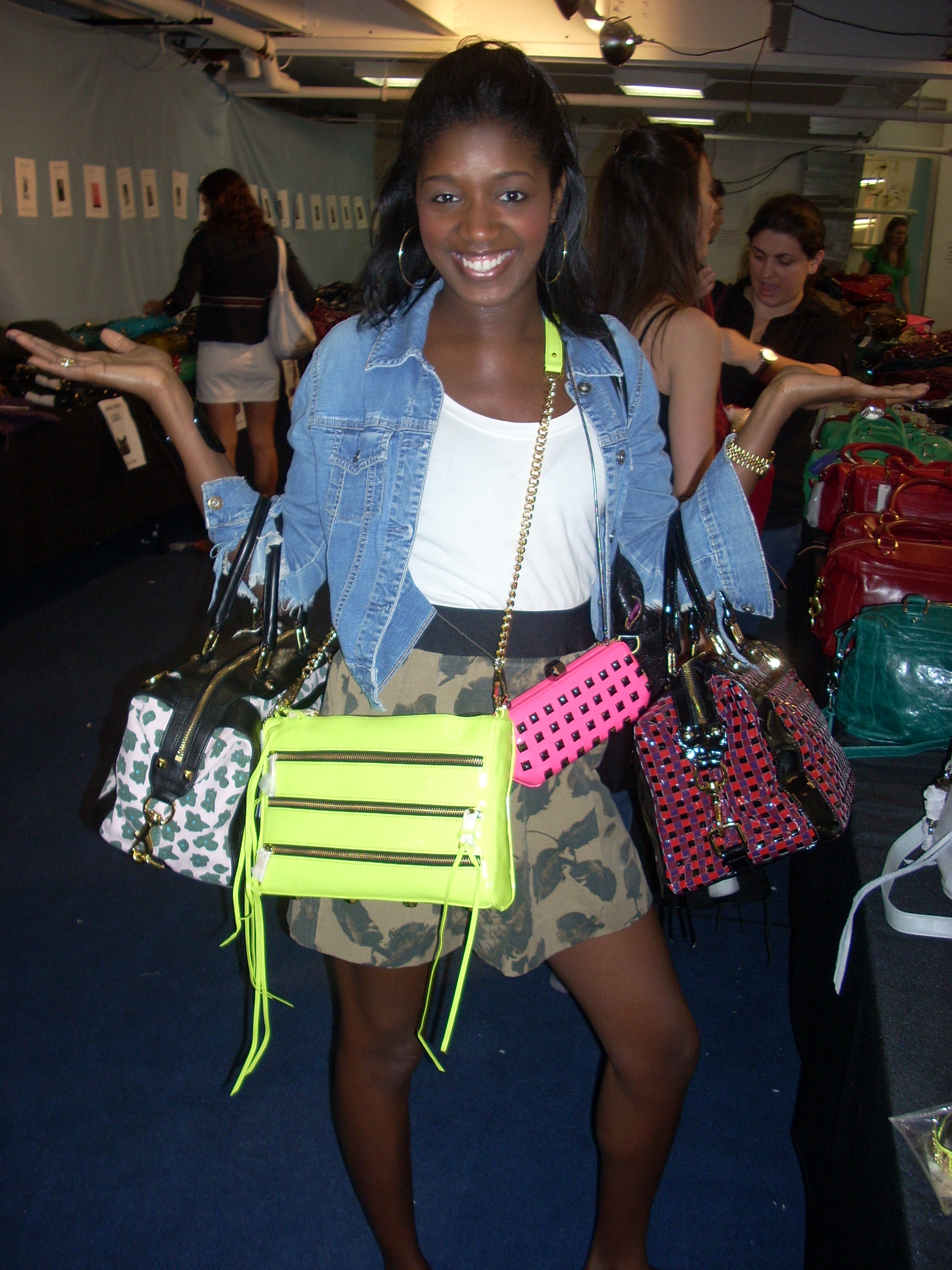 The purses were plentiful, the jewels jinglin’ and Mimi…well, Mimi was plain MADDDDD4Minkoff! I had handbags hangin’ everywhere as I walked around with no less than six items strapped to my body. 3zip Rocker in neon lime or the way too cute studded clutch? Le Sigh! A fashionistas’ quandry.
