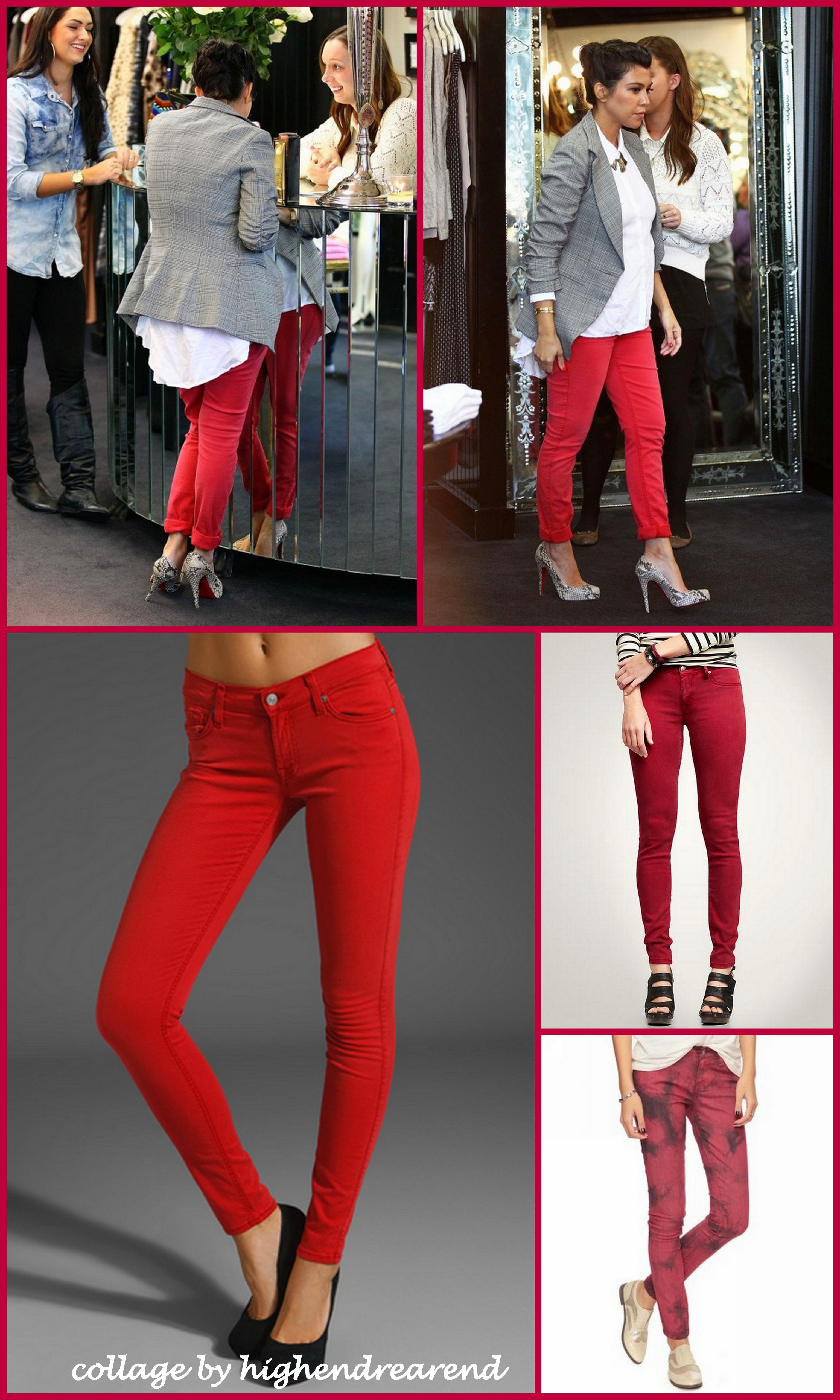 As soon as I saw her rockin’ red jeans, I knew my closet was aching for a pair. I absolutely love how she’s rolled them effortlessly a few inches above her TDF Loubitins. And the combo of the fully-buttoned asymmetrical white blouse and preppy grey blazer adds the perfect compliments!