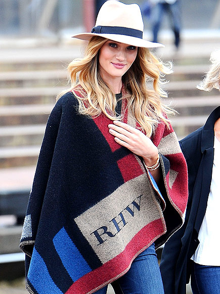 Well, maybe we are because within mere minutes of each other, we were obsessing over this totally lust-worthy pic of Rosie Huntington-Whiteley. She looks so fall-forward I could just…leap into a pile of leaves and die. Perfect waves under a great hat and that delicious monogrammed Burberry poncho. #deadski