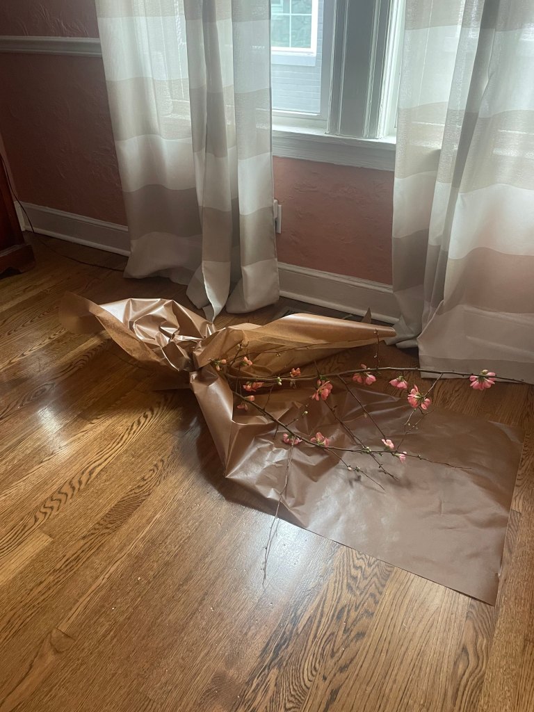• Quince branches in my entryway from a favorite local flower shop. Like me, they just keep blooming! (I had to!)