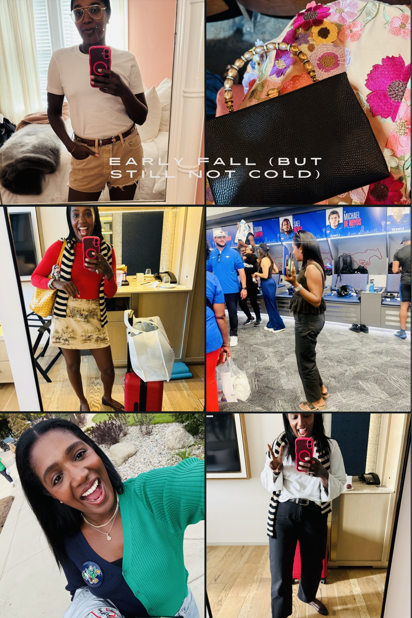 If you haven’t heard, football season is upon us! Despite being an Uber Fashion Principessa, I am also a Psychotic Football…Principessa. So with that said, I have to be prepared to turn a look at a minimum of four games per season. I was packing for a Dallas trip that included a “wear black” mandate for an 80 degree SMU game, so decided to rock my no-fail black Carhartt chinos, an infamously great peplum top via Amazon, my OG Brighton belt and black Jack Rogers sandals. It was such a hit, I was escorted straight to my box seat without so much as scanning a game ticket! For a recent match-up at my alma mater, I was contending with pending torrential rain, unseasonably hot temperatures and the ever-present threat of an ex, so had to be incredibly judicious with my outfit. I landed on the LOML split-color Staud cardigan, Slvrlake Londons and my platform Doc Martens— with a shiny silver raincoat tied around my waist. Sometimes, even a fashion girlie has to come down to earth to get the big win.