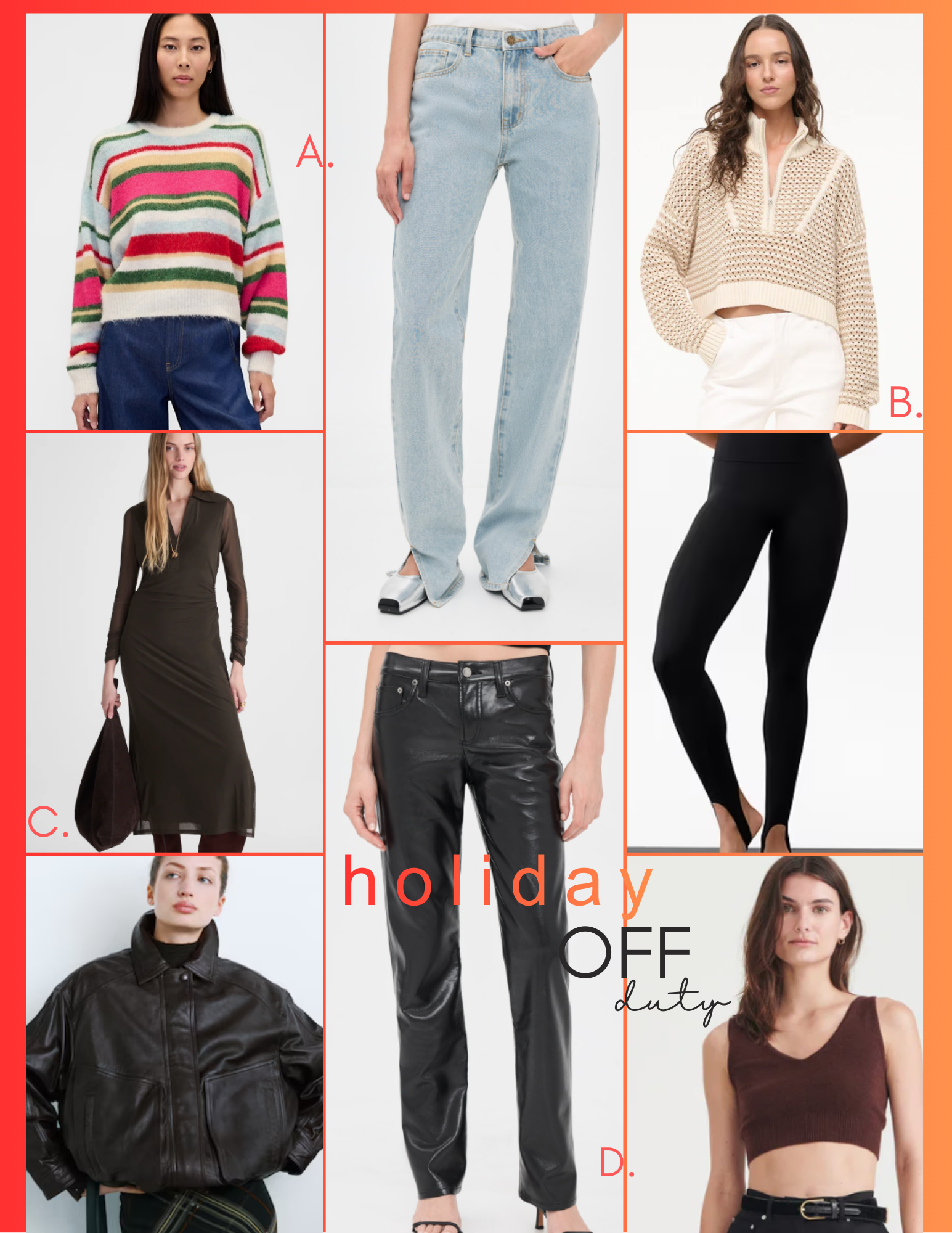 D. Fun Lunch With Friends: How fun to catch up with friends for an on-the-fly lunch in the midst of all the hubbub of fancy cocktail parties and over-the-top family gatherings? Go full cool girl in barrel jeans or leather trousers + a slim tank and a fabulous third piece. We all know I am very much a Nadaam Stan, so hop to their too good BF sale! I get non-stop wear from my leopard print booties, so find my favorite version here or venture into snakeskin here. Natalie Borton is a fantastic follow for this exact style of perfect denim paired with simple, but statement-making accessories. She has also recently added a compelling assortment of vintage outerwear to her Cali-based designs.
