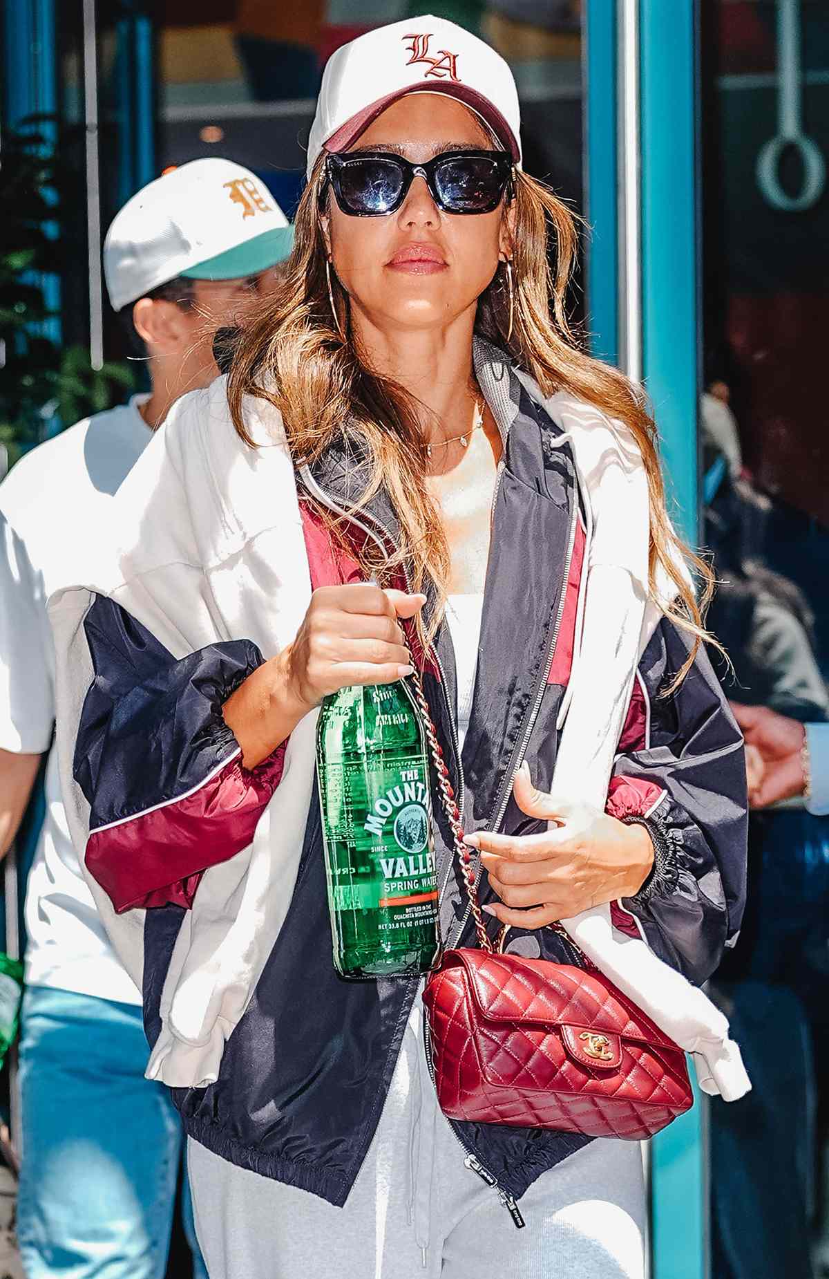 On the opposite end of the spectrum is her Cali Casual in the City look, complete with a giant Mt. Valley spring water and her new Marvel beau! I adore the throwback windbreaker paired with a perfect cherry-red Chanel flap. She’s rocking hoops once again, and puts them together with classic Wayfarers in glossy black and a white knit thrown over her shoulders. I would love to recreate this look in more muted shades of green and blue, obviously paired with the iconic Yankees x MoMA hat and Elisa Johnson shades in this incredible shape. Will also accept a Marvel Movie Man.
