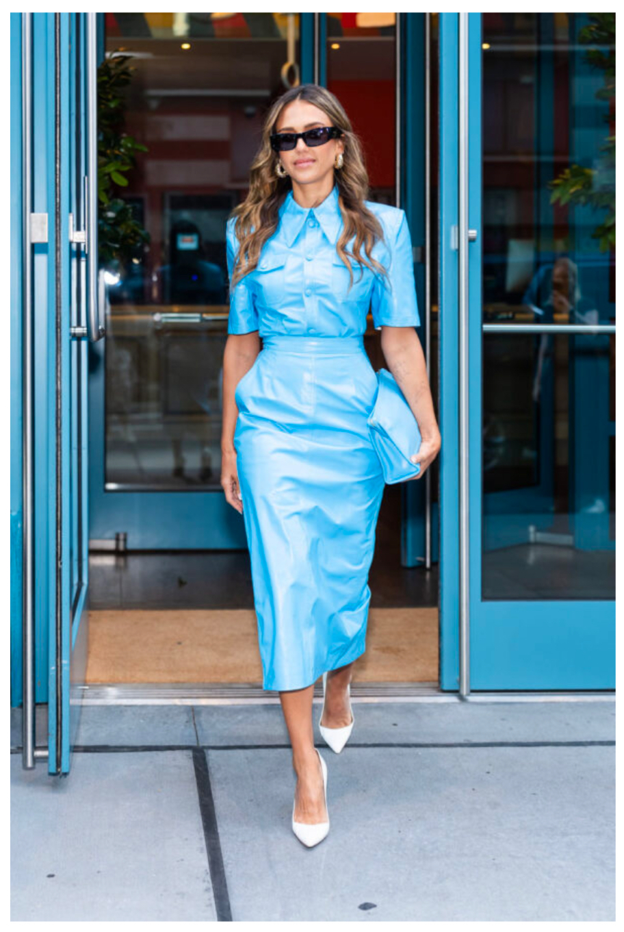 This blue-forward all-leather look is killer because Jess balances the boldness of the color palette with the boldness of being smokin’ hot! I die for her perfect hair and gold hoops, and can we please give it up for the well-placed white stiletto? Ever the businesswoman, she likely whipped this look together for an Honest Beauty Q3 financial planning meeting! I would re-imagine the styling for real life in all black or olive green leather and sub the heels for a high boot, but keep the un-fussy hair and hoops via these Jennifer Fishers.